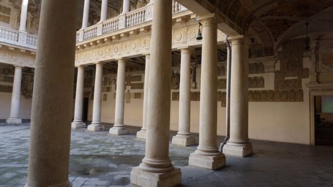 Ein weiteres Highlight ist der Ehrenhof (Cortile d’Onore), entworfen im 16. Jahrhundert von Andrea Moroni. Das Atrium beeindruckt mit einer Doppelloggia: